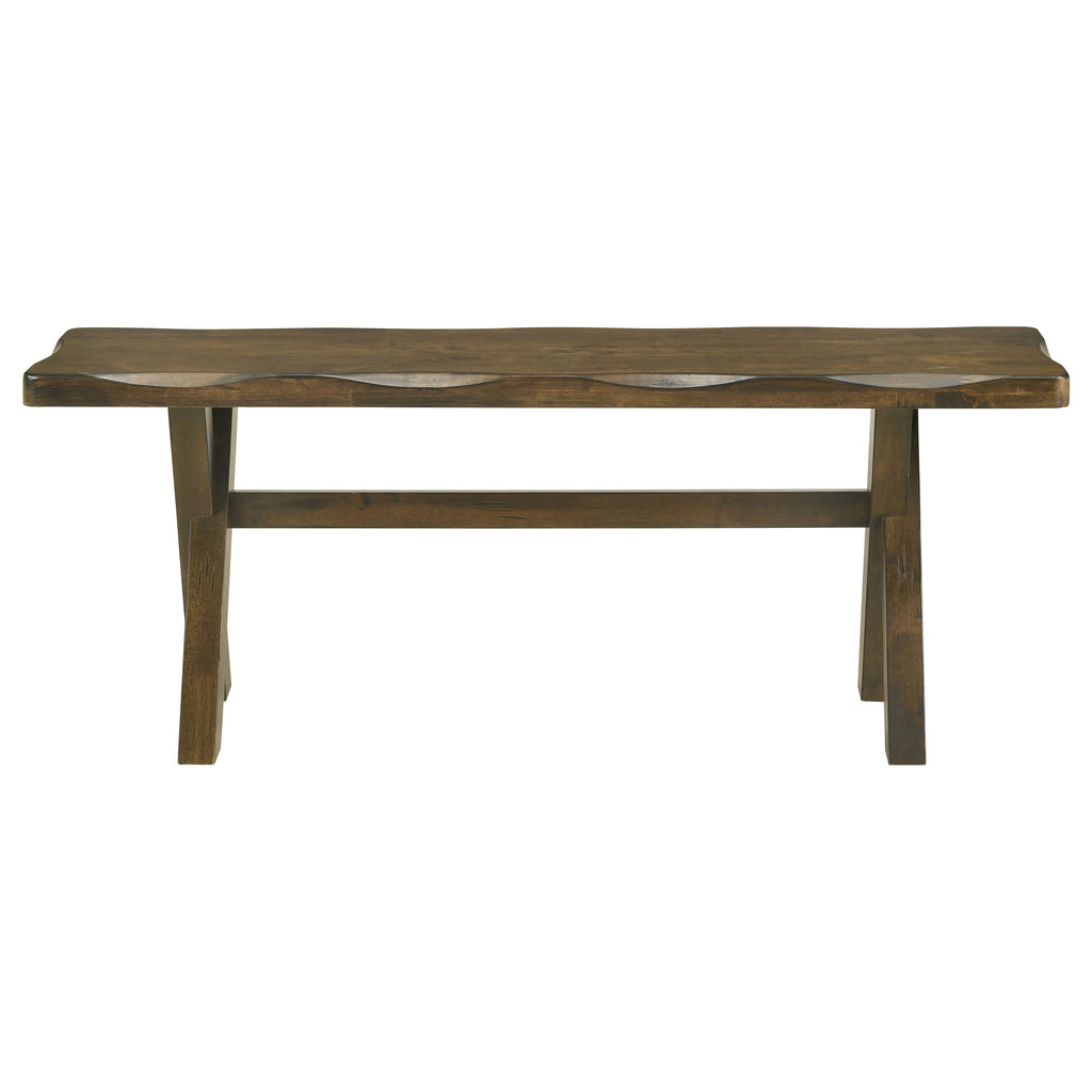 Rustic warmth and timeless craftsmanship define this inviting dining collection. Built from solid rubberwood in a knotty nutmeg finish, each piece showcases organic wood grains and hand-planed edges that lend a handcrafted feel. The rectangular table’s trestle-style X-base adds a modern farmhouse touch, while the ladder-back chairs feature padded fabric seats for everyday comfort. Designed to bring people together, this collection blends durability, charm, and relaxed sophistication for any dining space. Key Features: • Rectangular dining table crafted from solid rubberwood in a knotty nutmeg finish • Ladder-back chairs with padded fabric seats provide comfort and rustic charm • Hand-planed tabletop edges create an artisanal live-edge look • Durable polyester-cotton blend upholstery ensures long-lasting use • Trestle-style X-base adds structure and modern farmhouse character • Perfect for casual or formal dining spaces with timeless appeal
