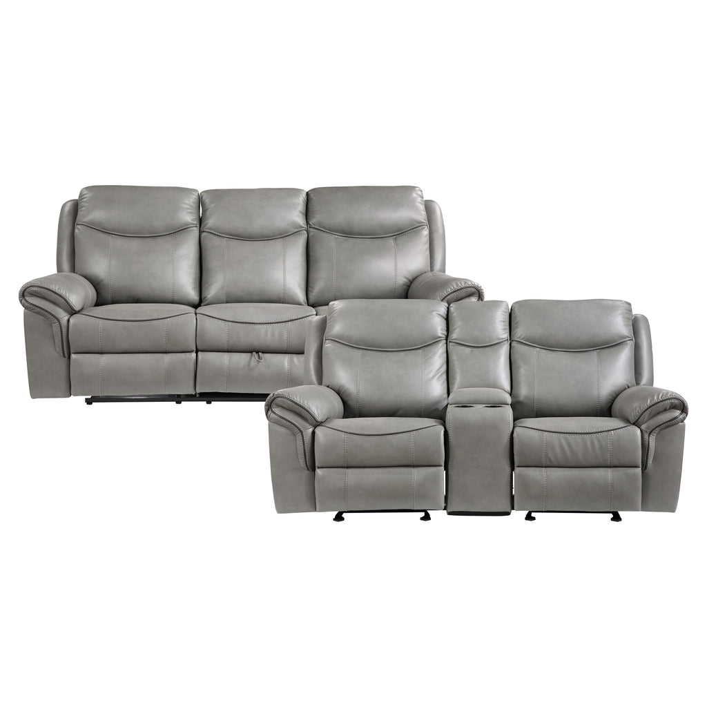 Plush seating, functional accessories and versatile styling blend effortlessly to create the look of the Aram Collection. The gray breathable faux leather upholstery covering will pair perfectly with your transitional decorative preference. The sofa features dual reclining ends, a drop-down center seat back with cup-holders and both electric and USB receptacles, and a hidden storage drawer located below the center seat. The dual glider reclining ends of the love seat flank the center console which features cupholders, as well as electric and USB receptacles that are located within the storage compartment. A glider reclining chair is also available. The manual motion reclining mechanisms of each piece in the collection operate with the pull of a side-mounted tab, that once engaged, take you from seated to reclined in an easy motion.