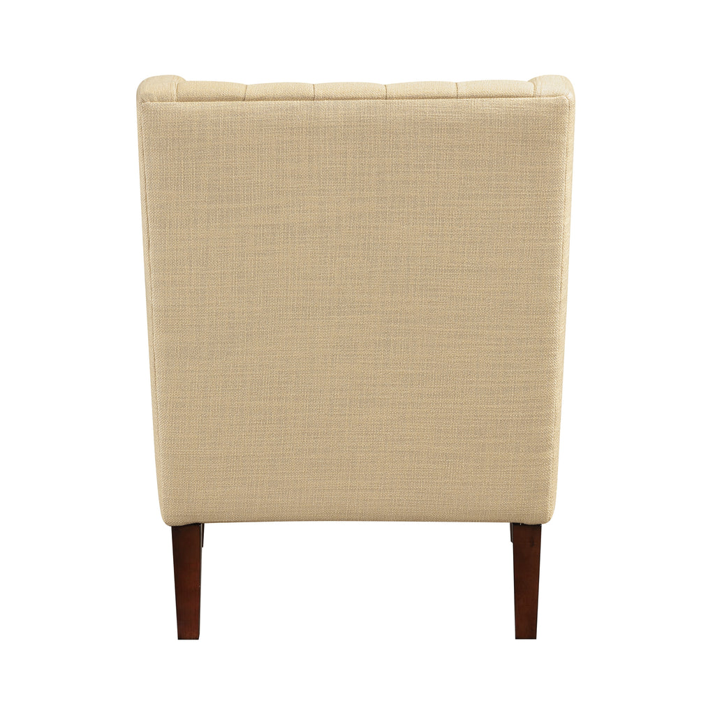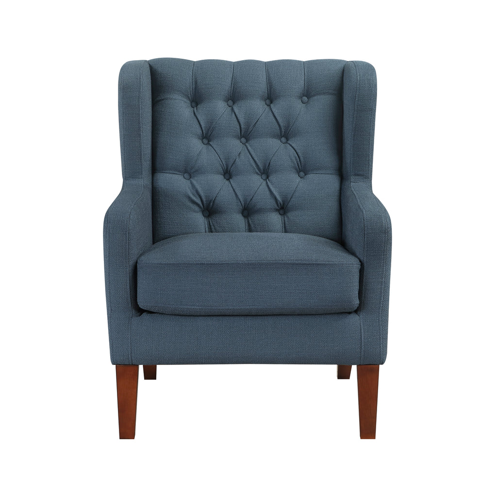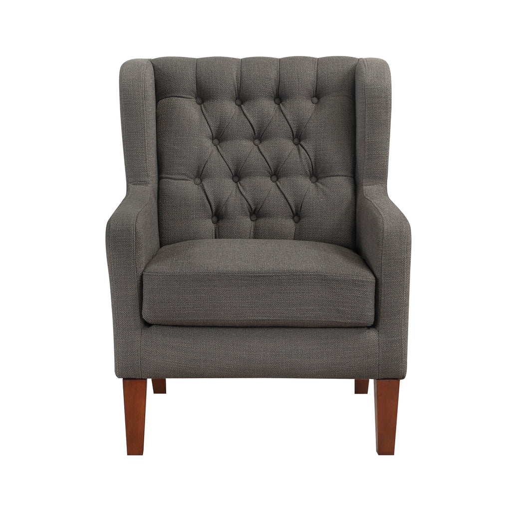 Upgrade your reading nook or living room with this classic wingback accent chair, featuring elegant button-tufted details and a timeless design. Built on a durable plywood frame with a robust 300lbs weight capacity, this chair ensures lasting stability. Experience superior comfort thanks to the plush, high-density foam padding over pocket coils and the soft textured fabric upholstery. Finished with rich solid wood legs in a brown finish, this wingback chair, featuring an attached back and reversible seat cushion, is the perfect blend of sophisticated style and luxurious seating comfort for any home.
