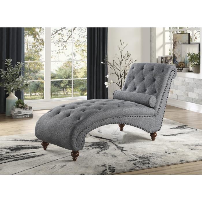 Your preference for modern traditional styling and comfort intersect in the design of the Bonne Collection. Contoured for your ultimate comfort and trimmed with traditional accents, the timeless look will be a wonderful addition to your boudoir or living room. The brown textured fabric covered chaise features button tufting, rolled bolster pillow, nailhead trim and espresso-finished turned wood legs. Also offered in gray.