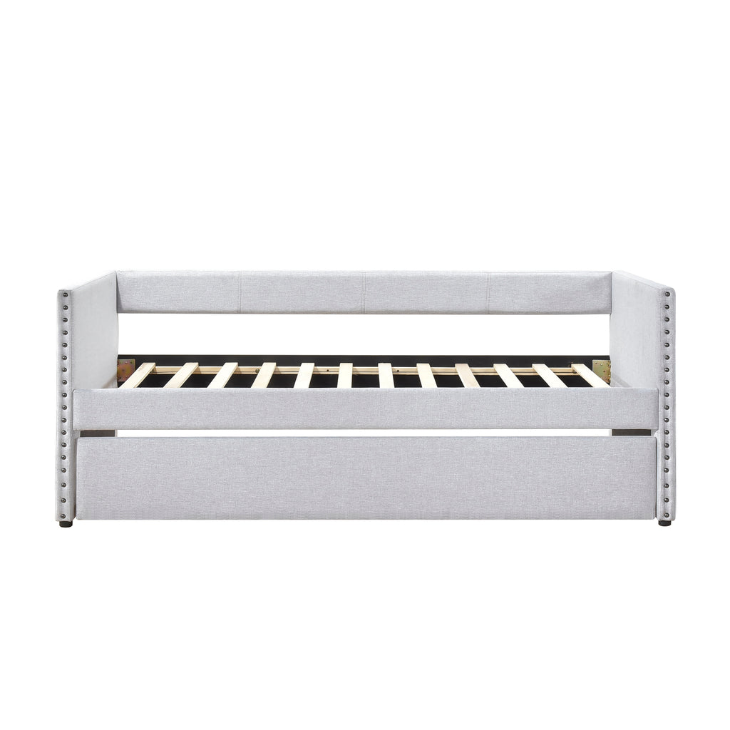 Maximize your guest room or living space with this stylish beige textured fabric daybed, featuring a convenient pull-out trundle bed for extra sleeping space. Crafted with a sturdy plywood and engineered wood frame, soft textured fabric upholstery, and elegant nailhead trim, this daybed offers both comfort and sophistication. The trundle bed, equipped with casters for easy movement, provides a seamless sleeping solution for overnight guests. Each side features convenient storage pockets for personal items. Designed to eliminate the need for a foundation or box spring, this daybed offers a sleek, modern look that complements various décor styles. Assembly is required and it ships in one box.