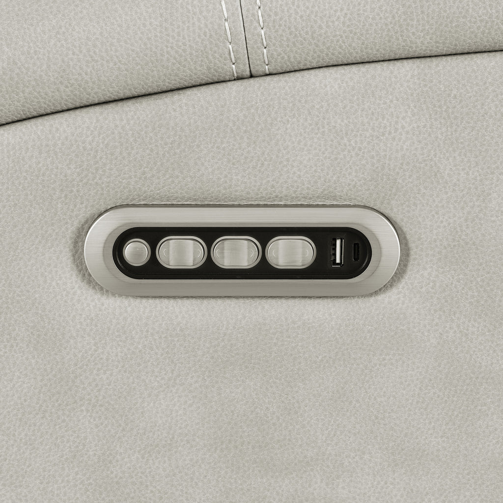 Designed to embrace your every mood, this triple power reclining loveseat transforms quiet evenings into indulgent escapes. Rich leatherette envelopes sculpted cushions, tailored with striking contrast stitching for a refined, modern aesthetic. Effortlessly adjust the power recline, headrest, and lumbar support with an integrated control panel, complete with dual USB ports to keep your devices powered and close. Thoughtfully placed armrest cup holders elevate your lounging experience, while a rear AC access port with emergency battery option ensures seamless operation, no matter the moment. Key Features: • Triple power reclining loveseat with power headrest and power lumbar for total body support • Integrated control panel includes USB A and USB C charging ports plus one-touch home button • Power recline function offers smooth motion with supportive lift from head to lumbar • Armrests conceal stainless steel cup holders for easy-access refreshment • Rear-mounted AC plug-in supports optional 9V battery for power-outage recline reset • Charcoal leatherette upholstery with contrast stitching adds tailored texture and depth