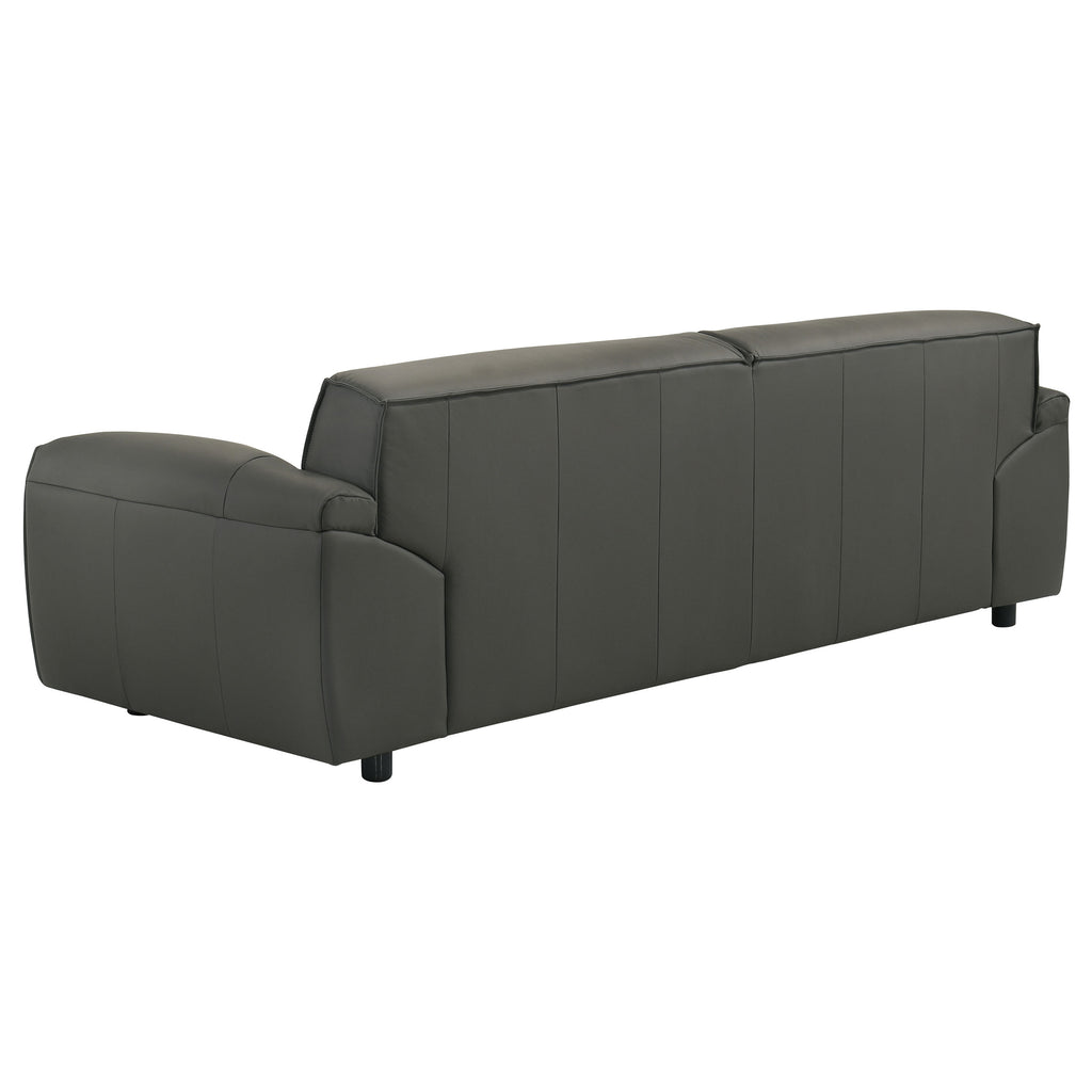 Sleek and sculptural, this leather-upholstered sofa blends minimalist form with elevated comfort. Wrapped in 100% genuine top grain leather, it offers a luxurious hand and timeless presence. Wide track arms and a low-profile frame shape a bold, architectural silhouette, while deep seating and padded back cushions provide an inviting place to unwind. Built with sinuous spring support and high-density full foam seating, it delivers lasting comfort wrapped in tailored sophistication. Key Features: • Sofa upholstered in 100% top grain leather for premium texture, durability, and refined comfort • Orange tone adds rich depth and modern character to any living space • Low-profile frame with wide track arms offers sculptural appeal and relaxed style • Deep seat cushions and padded backrests provide supportive lounging • High-density full foam seating ensures consistent comfort and lasting shape retention • Sinuous spring foundation delivers flexible support and balanced weight distribution