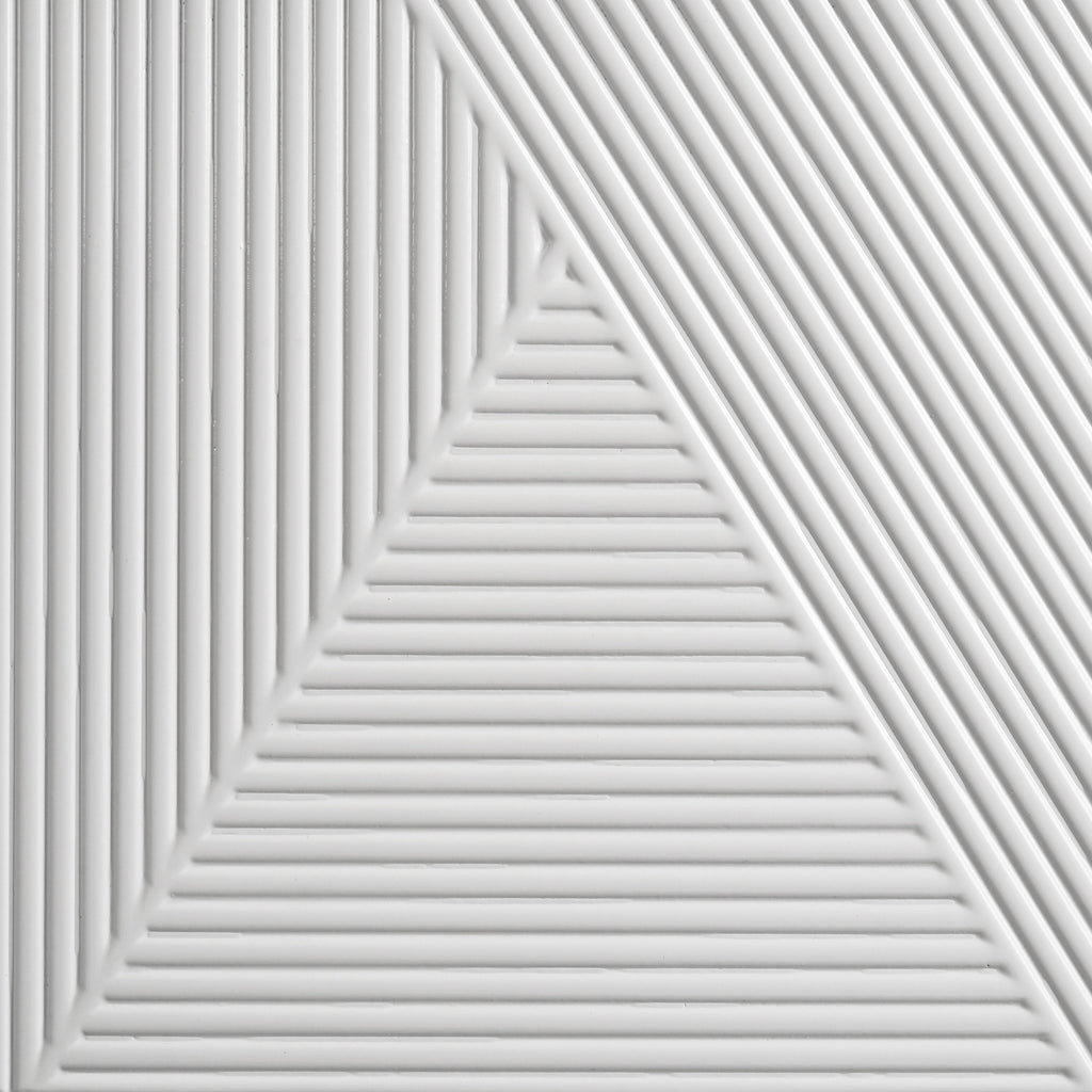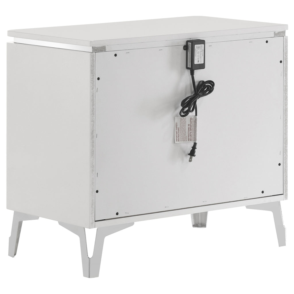 Crisp white high gloss and sculptural textures define this modern bedroom set, blending sleek surfaces with dimensional details. Geometric drawer fronts feature ribbed V-patterns and polished chrome pulls, while all drawers glide smoothly on 45mm metal extension hardware. The headboard stands out with chevron-tufted white faux leather framed by soft white LED trim. Completing the ensemble, a coordinating LED dresser mirror adds ambient glow and polished symmetry to the space. Elevated on chrome legs, this set is a showcase of contemporary form and function. Key Features: • White high gloss bedroom set with sculpted drawer fronts and chevron-tufted LED headboard • LED dresser mirror adds ambient lighting and visual symmetry to the modern design • All drawers include 45mm metal extension glides for smooth and reliable performance • Top drawers are fully lined in black felt to protect valuables and add elevated utility • Chrome U-shaped pulls and tapered acrylic legs provide sleek contrast and support • Crafted from engineered wood and faux leather for durability and shine