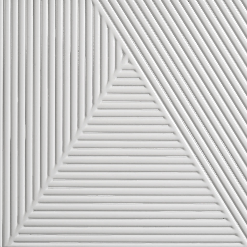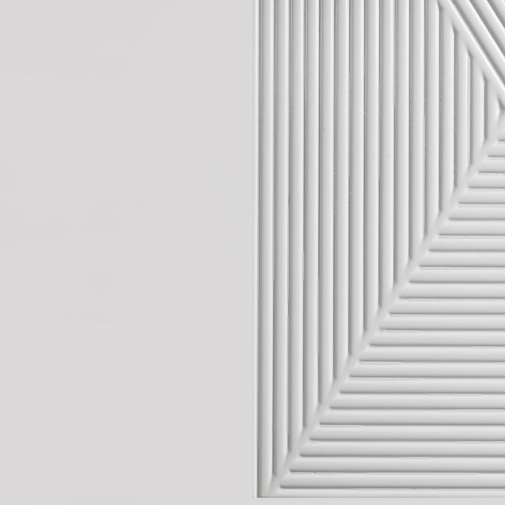 Sophisticated and dimensional, this six-drawer dresser and mirror set makes a bold statement in a high-gloss white finish. The dresser features geometric drawer fronts with fine ribbed texture forming inverted V patterns, paired with polished chrome U-shaped pulls. Black felt lines the top drawers for a touch of refinement, while 45mm metal extension glides ensure smooth operation. Above, the matching mirror glows with integrated white LED trim for ambient lighting and crisp contrast. Key Features: • Six-drawer dresser in white high gloss finish with sculpted geometric drawer fronts • Top drawers are fully lined in black felt to protect valuables and add a refined touch • Equipped with 45mm metal extension glides for smooth and quiet drawer operation • Polished chrome U-shaped pulls accent the textured surface with modern shine • Framed mirror includes integrated white LED trim for bright, ambient lighting • Crafted from engineered wood for a sleek and durable finish