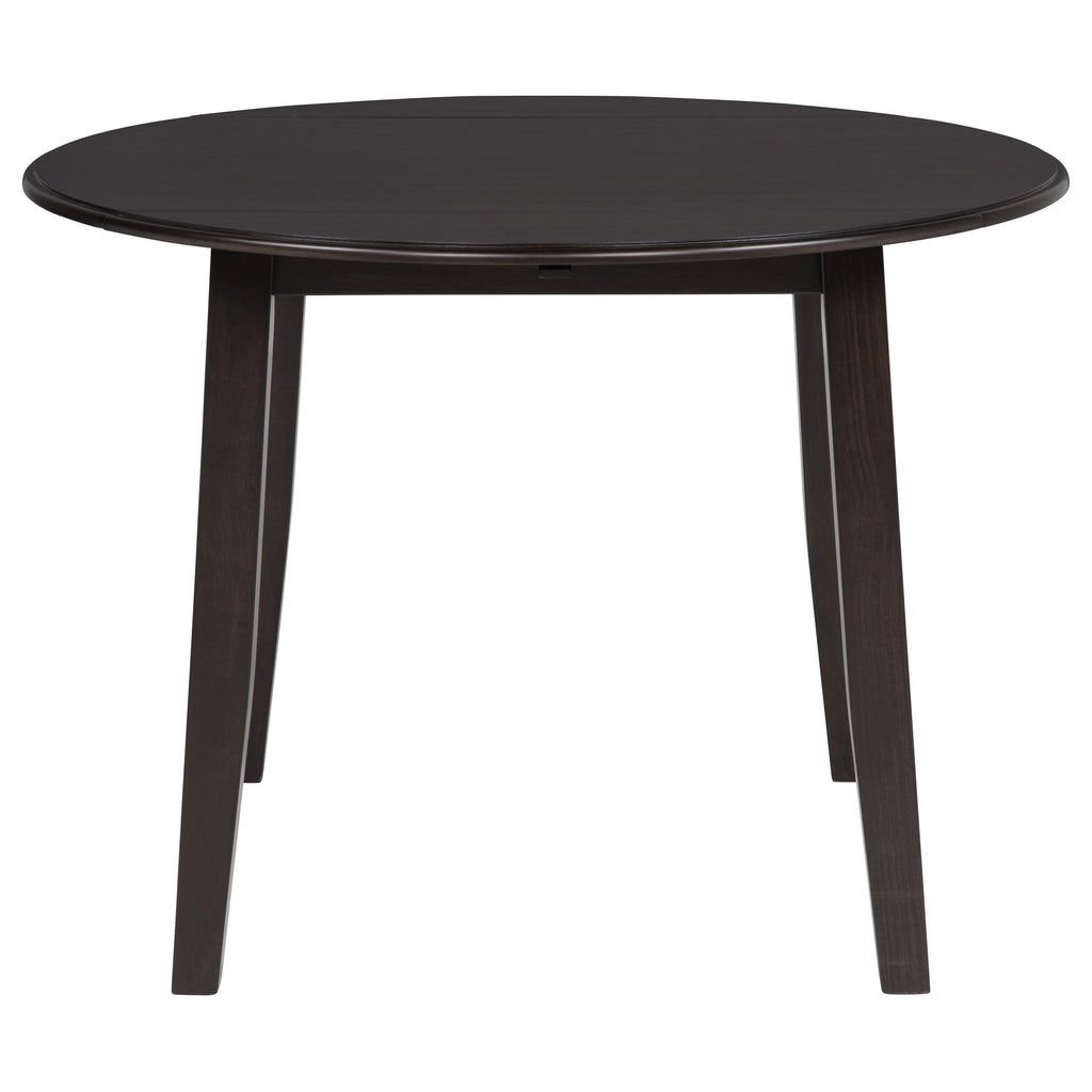 Gracefully tailored for intimate meals and lingering conversation, this five-piece round dining set brings charm and function to the heart of your home. The drop-leaf table blooms with ease, offering flexibility for everyday dining or special moments. Each chair cradles you in comfort with its curved backrest and plush ivory seat. Rich in dark coffee tones and crafted from rubberwood, mango, and engineered wood, it weaves elegance and warmth into every shared gathering. Key Features: • Five-piece round dining set with drop-leaf table for casual and expanded dining use • Dark coffee wood finish lends richness and warmth to compact dining spaces • Drop-leaf top folds down to conserve space when not in use • Chairs feature gently curved backs and soft cushioned seats in ivory fabric • Crafted from rubberwood, mango, engineered wood, foam, and fabric upholstery • Perfect for cozy kitchen corners, apartments, or breakfast nooks