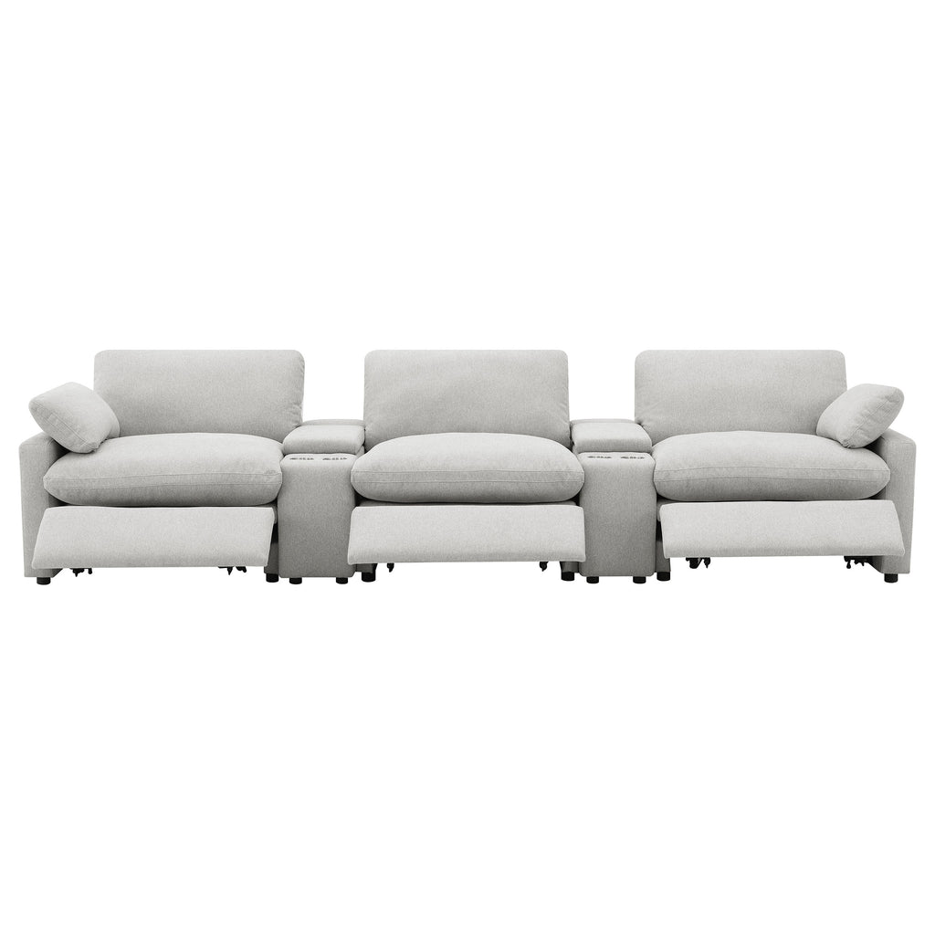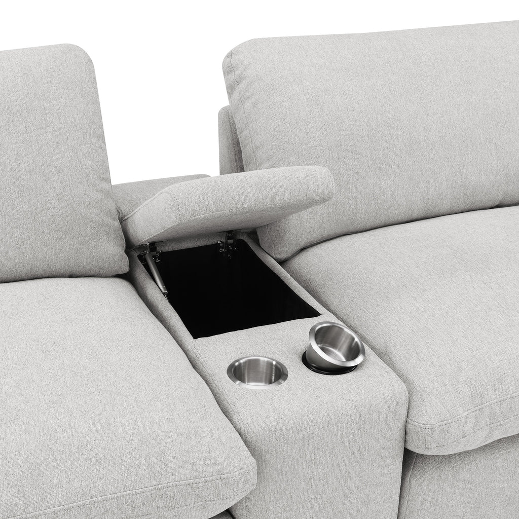 This three-seat home theater seating set combines modern convenience with plush comfort. Each power recliner offers smooth adjustability, while two center consoles feature lift-top storage and dual stainless steel cup holders. Upholstered in soft fabric, the generously padded cushions and pillow-top armrests enhance relaxation. Built for durability and long-lasting support, this seating arrangement is perfect for creating a cozy entertainment space. Key Features: • Three-seat home theater seating with smooth power reclining functionality • Soft grey fabric upholstery provides a plush, inviting seating experience • Two center consoles include lift-top storage for convenient organization • Dual stainless steel cup holders in each console for easy drink access • Pillow-top armrests and generously padded cushions for added comfort • Smooth, adjustable reclining mechanism offers personalized relaxation