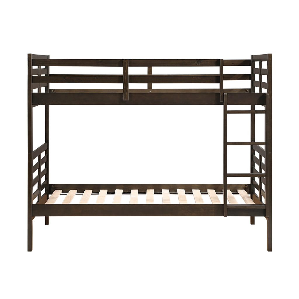 Maximize space and add functional style to any shared bedroom or sleepover spot with this classic twin-over-twin bunk bed. Crafted from a durable blend of oak veneer, wood, and engineered wood, and finished in a rich dark brown, this bunk bed offers robust stability and a timeless aesthetic. The top bunk is equipped with secure guard rails for safety, while a sturdy, integrated ladder provides easy access. Designed for convenience, it includes slats for both beds, eliminating the need for bulky foundations or box springs. Perfect for children's rooms or guest spaces, this bunk bed provides a safe and practical sleeping solution (note: CPSC recommends top bunks not be used for children under 6; maximum mattress height for top bunk is 6 inches; 300lbs weight capacity per bed).