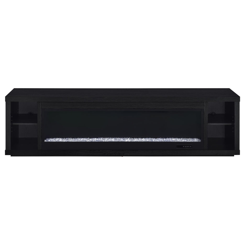 This sleek fireplace media console brings warmth and streamlined storage to contemporary living spaces. A wide electric firebox glows over crushed acrylic crystals, offering fifteen customizable flame colors operated by a wireless remote. Open side compartments with adjustable shelves store devices or décor, while rear cable management cutouts keep wires out of sight. Finished in classic black and crafted from engineered wood with a laminate veneer, it serves as a refined TV stand or entertainment center. Please note that this console does not include a heat function. Key Features: • TV stand fireplace console with flame visualizer and crushed acrylic crystals for visual warmth • Black finish highlights clean lines and adds bold, modern character to any space • Two open side compartments with adjustable shelves offer flexible display or storage • Fifteen flame colors with wireless remote control for lighting customization • Crafted from engineered wood and durable, scratch-resistant laminate veneer • Accommodates TVs up to eighty-five inches with rear cutouts for cable management