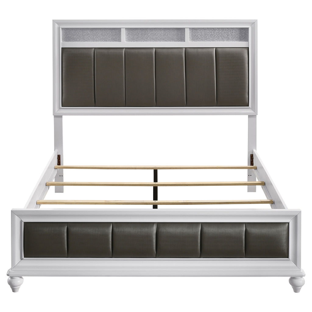 Infuse your bedroom with sleek sophistication and subtle glam with this panel bed. A tall headboard and matching footboard feature channel tufted panels wrapped in metallic leatherette, creating a striking focal point. The crisp white frame is detailed with molding for depth and finished with turned feet for timeless charm. Sparkling accents add a touch of radiance, while the bed is crafted from solid rubberwood, engineered wood, and okume veneer for strength and durability in everyday use._x000D_ Key Features: • Queen panel bed with white finish and glamorous metallic leatherette panels • Tall headboard and low footboard feature channel tufting for sleek dimension • Molded frame edges add depth and refined detail to the bed’s classic profile • Sparkling accent trim enhances the bed with a radiant and stylish touch • Crafted with solid rubberwood, engineered wood, and okume veneer materials • Turned bun feet complete the look with timeless and elegant design appeal
