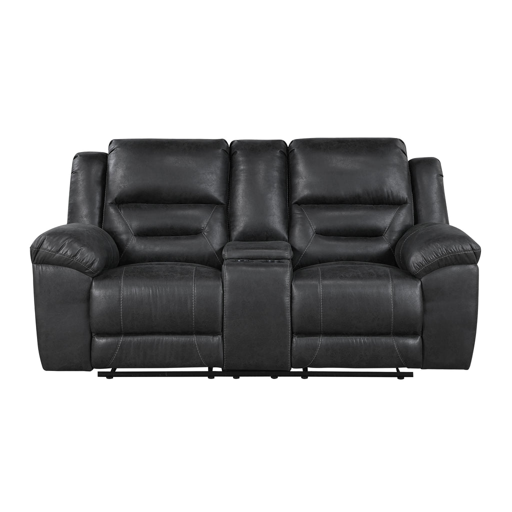 The Hazen Collection’s versatile style and functional design will be an inviting addition to your home’s living room. Dual end recliners are featured on love seat, with its center console providing secure storage of beverages via the two cupholders and a lift-top storage compartment. The reclining mechanisms of the love seat are engaged with a pull of their side mounted tabs, taking you from seated to prone in an easy motion. Black polished microfiber upholstery covers the plush pillow-top arms and contoured seating, creating a perfect combination ready for relaxation.