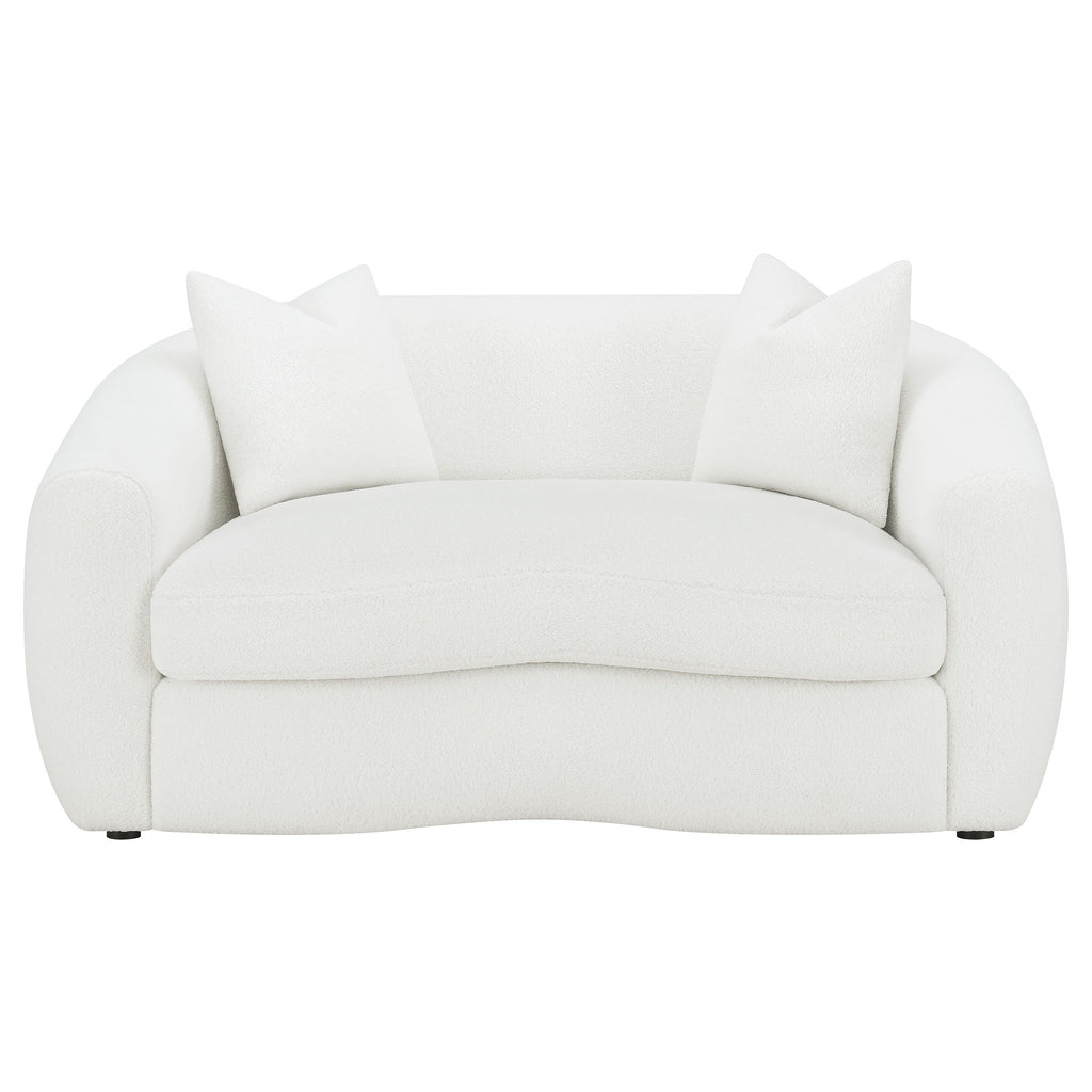 Transform your sophisticated modern living room with this vintage-like contemporary natural loveseat, featuring boucle upholstery that presents an inviting cloud-inspired resting place. Gracefully curved armrests, a single bench cushion, and a tailored backrest complete this retro-inspired look, accented by black legs.