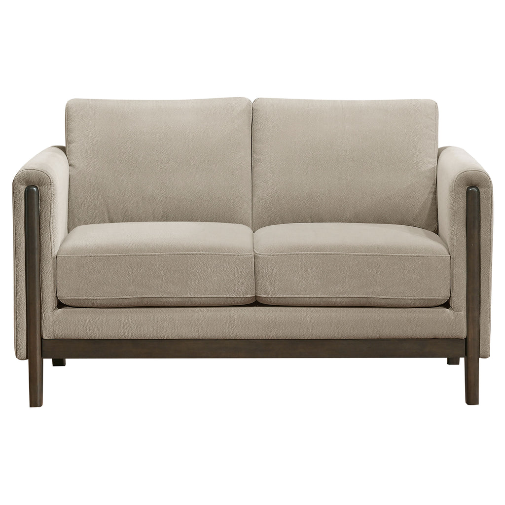 Modern lines and plush comfort come together in this upholstered loveseat, designed for relaxed refinement. A engineered wood frame in a rich coffee finish outlines its recessed panel arms, creating a clean, architectural silhouette. Wrapped in taupe polyester, the seat and back cushions are fully reversible for extended use and lasting comfort. Whether styled alone or with its matching counterparts, this piece offers balance and softness in equal measure. Key Features: • Loveseat features a low-profile design with clean lines and recessed panel arms • Engineered wood frame finished in coffee adds warmth and structured visual contrast • Taupe polyester upholstery offers soft texture and durable everyday use • Reversible seat and back cushions provide flexible comfort and long wear • Plush cushions offer relaxed support while maintaining a tailored look • Complements the matching sofa and chair for a cohesive living room ensemble