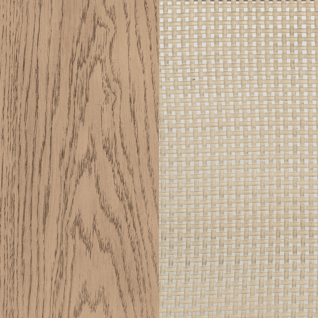 Elevate your space with this sophisticated vitrine cabinet, designed to showcase your most treasured items with style. Featuring two wood-framed tempered glass doors, the upper section offers four tiers of shelving, perfect for displaying decor, dinnerware, or collectibles. The lower section of the cabinet provides additional storage with two hand-woven cane doors and a shelf inside for hidden organization. Crafted from solid wood, engineered wood, and oak veneer, this display cabinet offers both open display and concealed storage options. Its timeless arched design and natural wood finish make it a perfect addition to dining rooms, living spaces, or home offices.