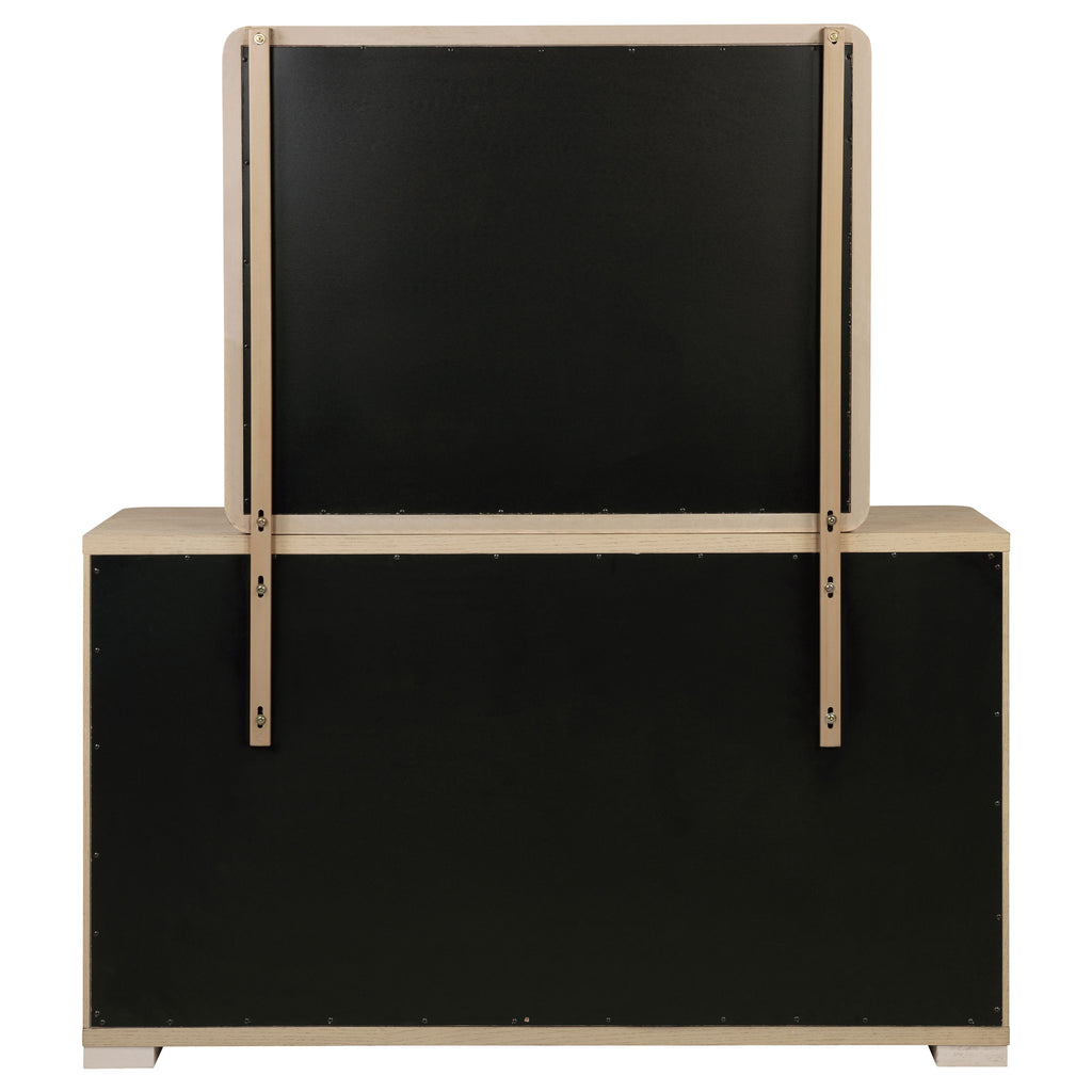 The dresser and mirror set combines function and elegance with its light elm finish and sleek contemporary design. The dresser features six extra-large tinted drawers, each crafted with French and English dovetail construction for durability. Brushed nickel fingertip pulls and rounded corners add refinement, while the matching rectangular mirror completes the look with its clean lines and softly rounded edges, creating a cohesive, modern bedroom ensemble. Key Features: • Light elm finish creates a modern, elegant aesthetic for the dresser and mirror set • Six tinted, extra-large drawers offer ample storage for clothing and personal items • French dovetail fronts and English dovetail backs ensure durable drawer construction • Brushed nickel fingertip pulls provide a refined accent to the contemporary design • Rectangular mirror with matching light elm frame and rounded edges completes the set • Durable construction and stylish design make this set a perfect fit for any bedroom