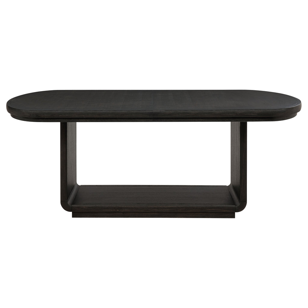 Rooted in quiet strength and sculptural beauty, this extension dining table brings graceful presence to every gathering. Its soft-edged rectangular top rests on a bold pedestal base, finished in burnished black for depth and contrast. When needed, a removable leaf extends the surface with the help of equalizing metal cable glides, allowing for smooth expansion. Whether hosting intimate dinners or festive occasions, this table adapts with effortless elegance. Key Features: • Rectangular extension table finished in burnished black with softened corners • Removable leaf extends the tabletop to nearly ninety-six inches with ease • Equalizing metal cable glides ensure smooth, balanced one-person operation • Architectural pedestal base provides sculptural support and open grounding • Elegant scale supports both everyday meals and larger dinner occasions • Constructed from ash veneer, rubberwood, and engineered wood