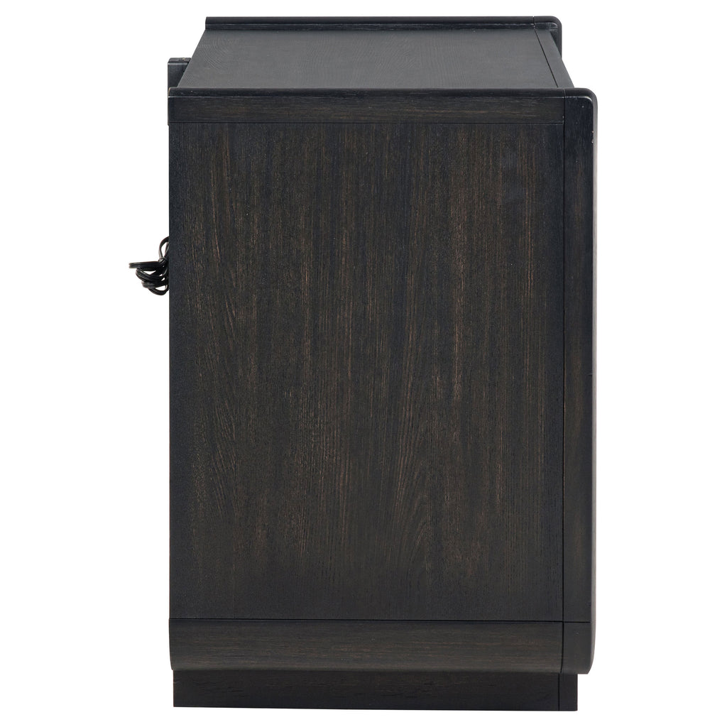 Dark elegance and quiet innovation come together in this two-drawer nightstand, where softened curves and a burnished black finish evoke serene sophistication. A warm LED-lit shelf casts a golden glow beneath the top drawer, creating ambiance for evening hours. Dual USB ports keep modern essentials close, while a black felt-lined drawer cradles delicate keepsakes. Built with soft-closing glides, English dovetail joinery, and a dust panel, this piece blends function with intimate beauty. Key Features: • Two-drawer nightstand with open shelf and integrated LED lighting for ambient glow • Burnished black finish enhances the wood grain with a rich, refined presence • Top drawer is black felt-lined to keep delicate items safely cushioned • Dual USB charging port includes both USB-A and USB-C for everyday convenience • Soft-closing ball bearing glides and dovetail joinery ensure lasting durability • Finished with a dust panel to maintain a clean, enclosed storage environment