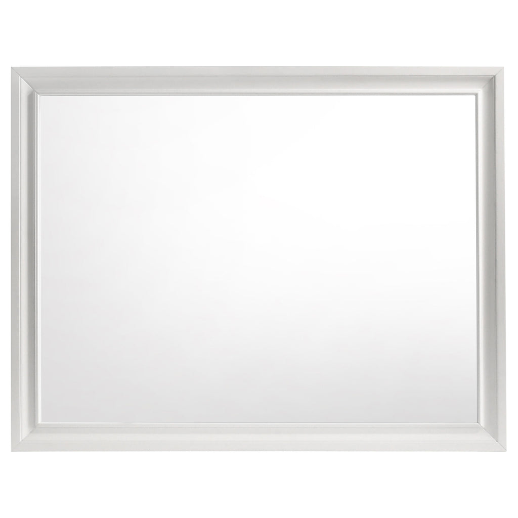 Sparkling diamond-like trim ups the glamour for a five-piece modern bedroom set. Compelling in its elegant simplicity, it centers on an upholstered bed and features a lightly textured white finish paired with smooth white molded trim. A nightstand, dresser with mirror, and chest provide plenty of drawers for easy storage and organization. Stripes of glittering, diamond-like trim and jewel-like bar pulls elevate the set, creating a fresh, sophisticated look and feel for your bedroom. Bracket feet complete the look with a touch of movement.