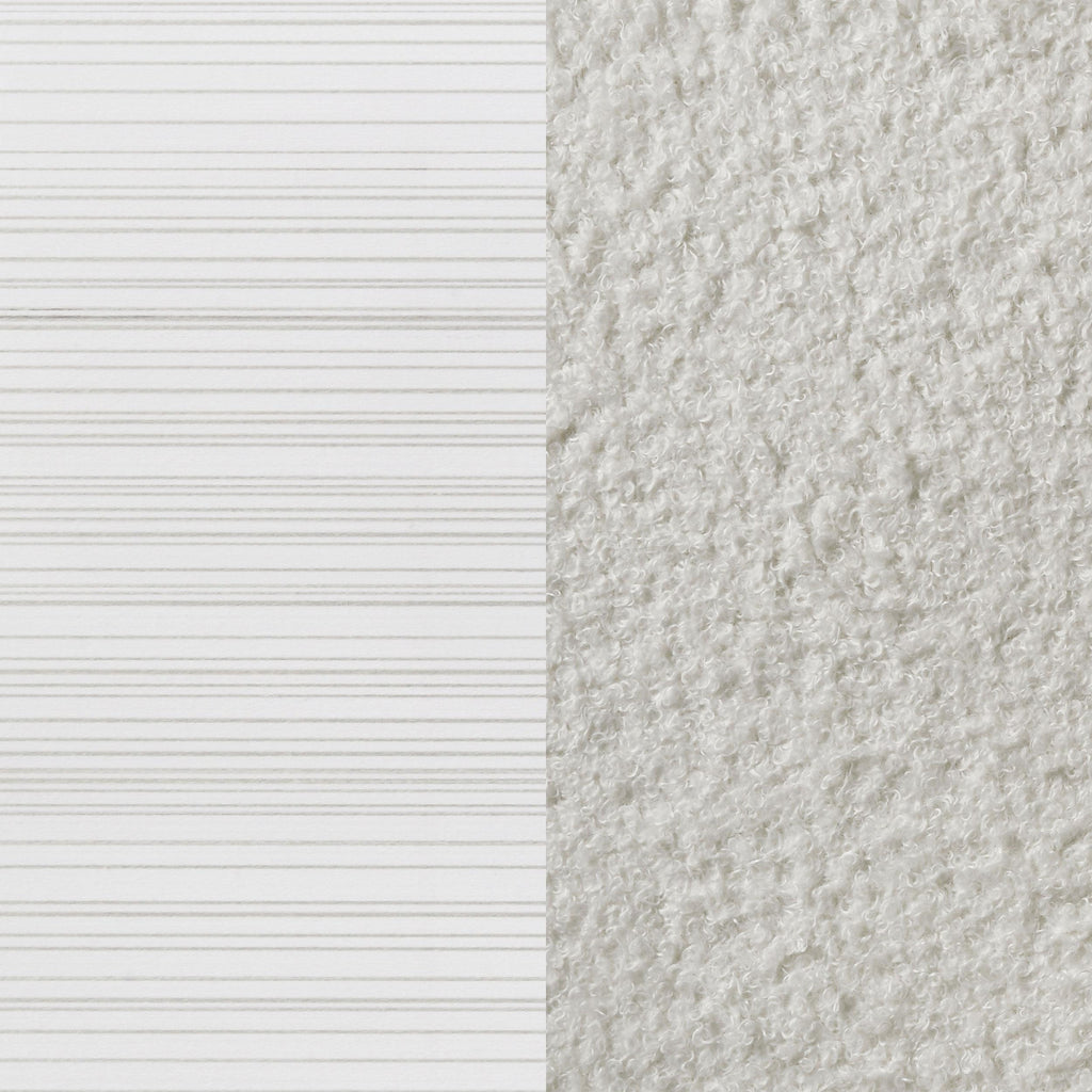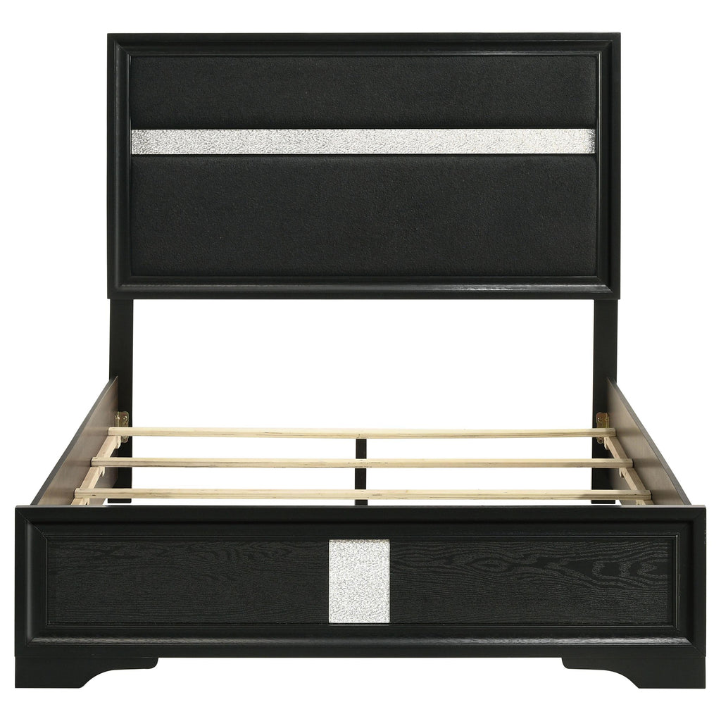 Introduce a little bit of glam flair to your bedroom with a modern upholstered bed. Featuring padded white fabric panels, the headboard is complete with molded trim and a horizontal stripe that glitters in the light. A matching vertical stripe on the low footboard is the perfect complement. A white finish is lightly textured on the panel footboard and rails, while trim is smooth and cool. The bed is complete with slats and center legs for added support and requires a foundation. Key Features: • Upholstered panel bed with padded headboard panels and glittering accent stripe • Smooth white molded trim contrasts with textured white panels for a dimensional look • Footboard includes a matching vertical glitter accent to coordinate with the headboard • Low profile footboard design opens up the room and softens the silhouette • Slatted base includes center support legs with levelers for added stability • Requires a foundation and accommodates most mattress types
