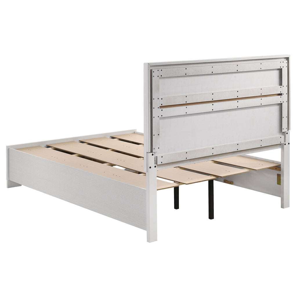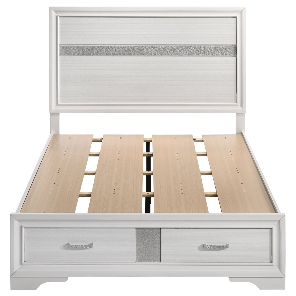 This alluring bed from the Miranda collection has both fashion and function. It features crisp lines and a headboard that's as simple as it is impressive. The footboard is built with two roomy drawers to hold extra sheets and blankets. The bed has an effortless timelessness and elegance. Add to the bedroom for a charming ambiance that's sure to please. Key Features: • Storage panel bed with integrated drawers in footboard design • Fully slatted platform eliminates need for separate foundation • Crystal-accent drawer pulls enhance the glamorous styling • Glitter trim accent at headboard and footboard adds visual interest • Bracket-style feet and beveled framing for a classic profile • Crafted with engineered wood in a bright white laminate finish