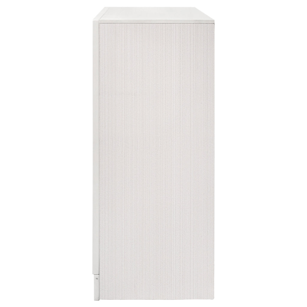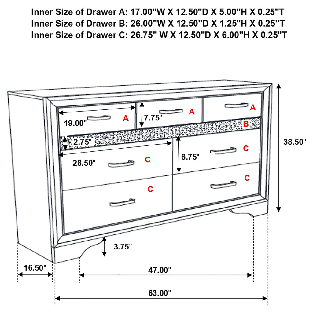 Infuse your space with sophisticated grace. The chic design of this beautiful dresser lends a touch of elegance to any bedroom. Felt-lined drawers keep delicate belongings safe and secure. A hidden jewelry drawer offers a discreet place to store your valuables. Complete with a glittery panel across the front, this piece exudes sparkling opulence. Key Features: • Nine-drawer dresser provides ample clothing storage • Hidden felt-lined drawer located behind glitter accent strip • Crystal hardware stands out against bright white surfaces • Smooth drawer operation with full-extension glides • Bracket-style base and beveled edges offer timeless form • Engineered wood and laminate build ensure durability