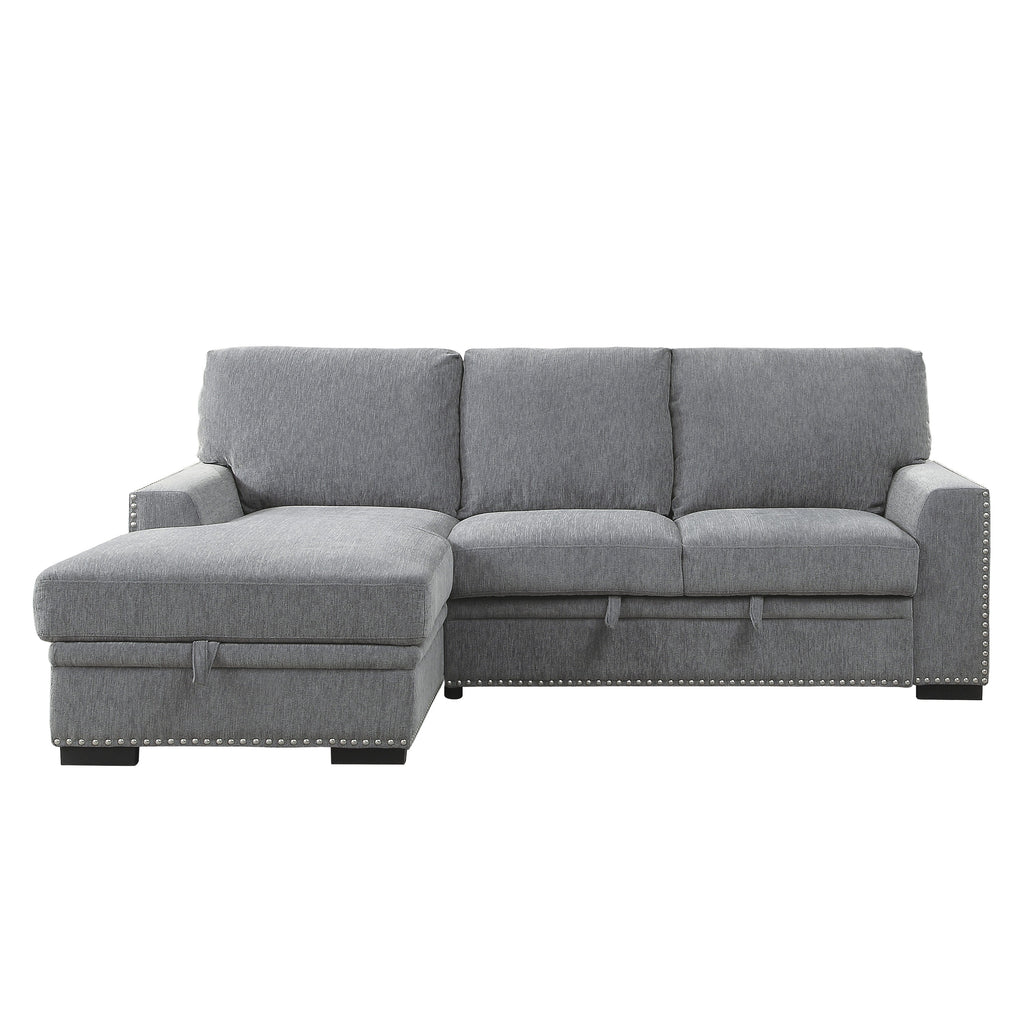 A perfect addition to your casual living room, the Morelia Collection’s functionality goes beyond that of a traditional sofa. Covered in beige chenille, the modern profile of this seating group is defined by its nailhead trim, loose back cushions and track-style arms. Conveniently stored beneath the sofa is a pull-out trundle that rises to create a bed while the top of the attached chaise opens to reveal under-seat storage. The left side chaise and paired two-seater create a configuration perfect for your living room's available space.A coordinating swivel chair lends complementing decorative accent with its barrel shape and loose back cushion.