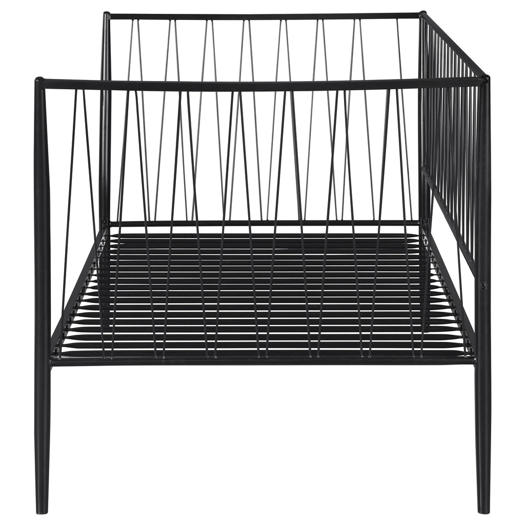 This transitional-style metal daybed combines sleek aesthetics with durable functionality, making it ideal for guest rooms or compact spaces. The design features slim, vertical metal slats with an angled backrest for a subtle modern flair. Welded metal construction ensures strength and stability, while the powder-coated matte black finish resists wear and adds sophistication. The integrated metal slatted platform provides dependable mattress support without requiring a box spring, emphasizing its minimalist appeal.