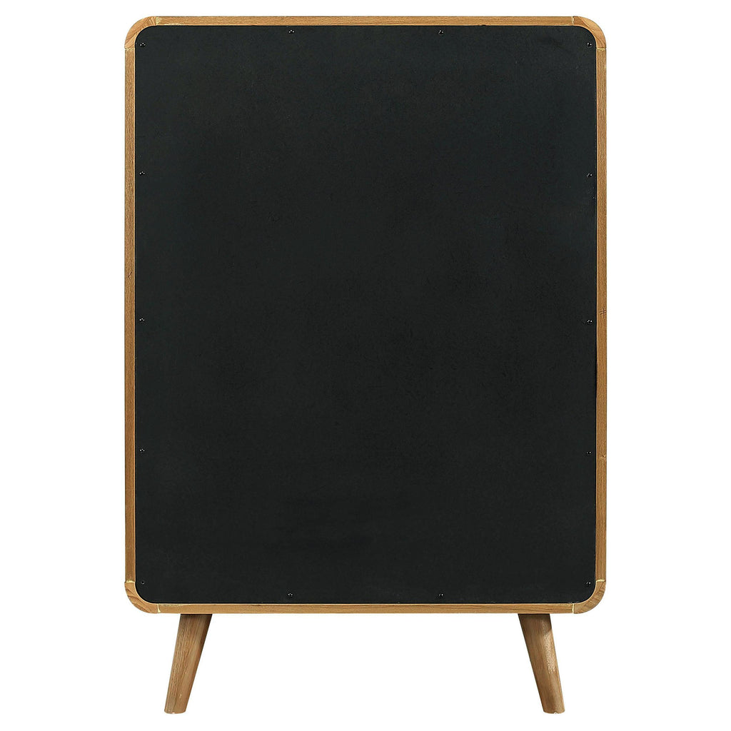 Stylishly organize your wardrobe with this mid-century modern chest of drawers, built with pine, engineered wood, and walnut veneer for durability and style. Featuring five spacious drawers, it offers ample storage for clothing and accessories. Rounded edges and tapered legs lend retro flair, while felt-lined top drawers add a touch of functionality. Smooth drawer glides and subtle metallic hardware complete this elegant storage piece. Key Features: • Five-drawer chest with a dark walnut finish for a bold look • Rounded edges and tapered legs enhance retro-inspired charm • Felt-lined top drawer provides safe storage for valuables • Pine, engineered wood, and walnut veneer construction ensures sturdiness • Metallic hardware adds a polished finishing touch • Smooth-gliding drawers offer effortless access