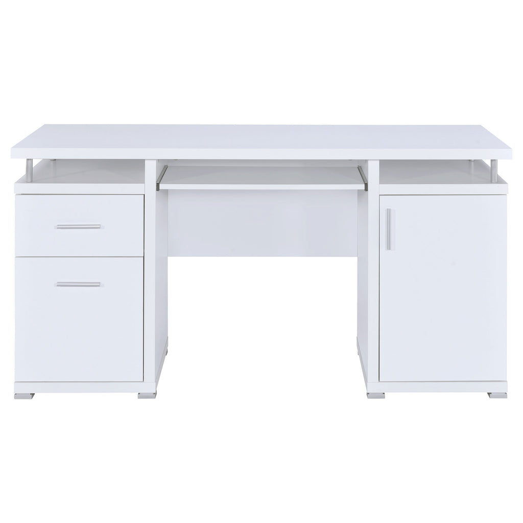 Upgrade your home office with sleek style and fabulous functionality. This handsome office desk has everything you need to be productive. Its large cabinet features an adjustable shelf for convenient storage. It includes a large file cabinet that fits legal and letter size files, as well as a smaller top drawer and keyboard tray. With a deep, rich finish of cappuccino, this desk is a stylish addition to any office.