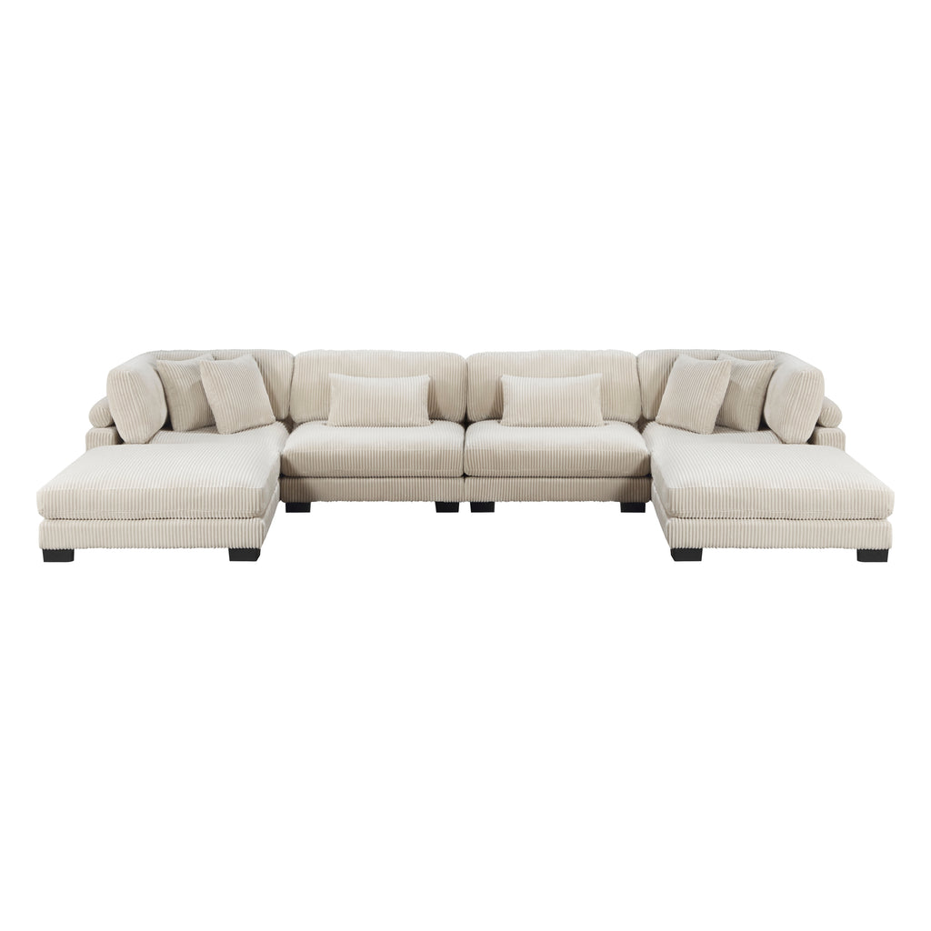 Configurable to your available space, the Traverse Collection allows for the addition and detachment of pieces for a customized seating experience. The 6-piece sectional configuration consists of two corner units paired with two armless chairs, and two ottoman. The plush beige corduroy fabric upholstery creates a plush expanse for a soft touch experience.